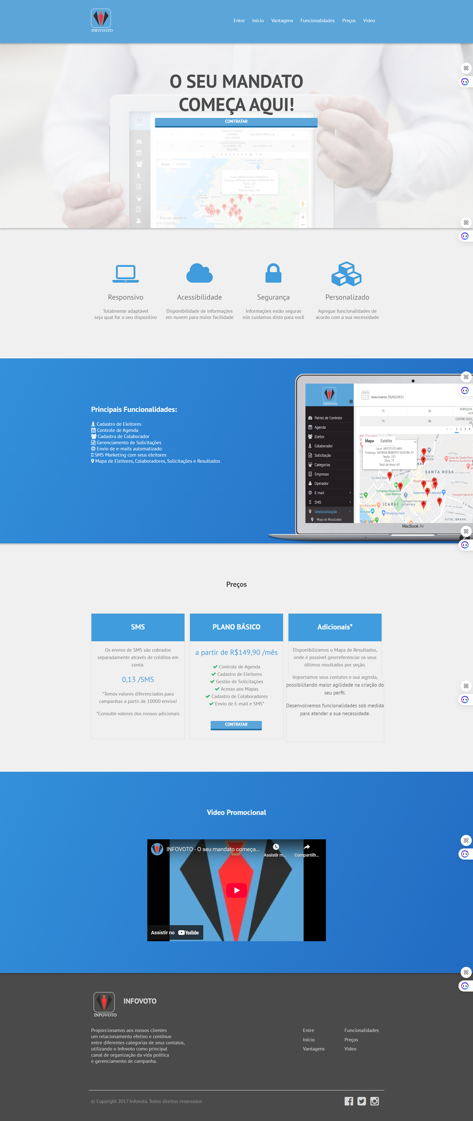 Controle de Agenda, Cadastro de Eleitores e Colaboradorrs, Gerenciamento de Solicitações, Envio de e-mails e SMS automatizado, Mapa de Eleitores, Colaboradores, Solicitações e Resultados Organize seus eventos e solicitações, comunique-se com seus eleitores e colaboradores de forma eficiente, visualize seus resultados. Otimize a sua campanha e automatize seu mandato.
